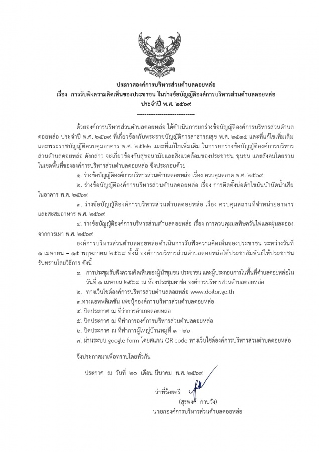 ประกาศองค์การบริหารส่วนตำบลดอยหล่อ เรื่อง การรับฟังความคิดเห็นของประชาชน ในร่างข้อบัญญัติองค์การบริหารส่วนตำบลดอยหล่อ ประจำปีพ.ศ.2569
