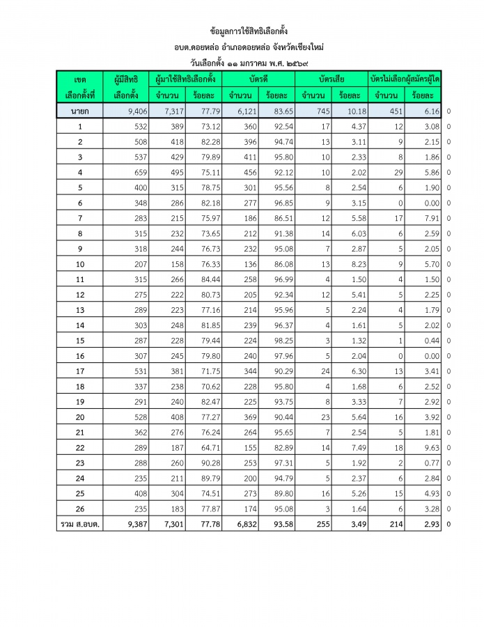 ข้อมูลการใช้สิทธิเลือกตั้ง อบต.ดอยหล่อ