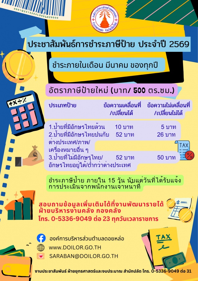 ประชาสัมพันธ์การชำระภาษีป้าย ประจำปี 2569 สอบถามข้อมูลเพิ่มเติมได้ที่่งานพัฒนารายได้ กองคลัง โทร. 0-5336-9049 ต่อ 23