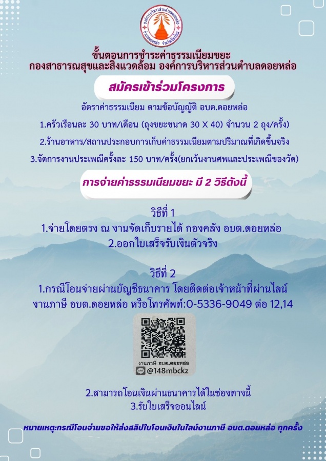 ประชาสัมพันธ์ขั้นตอนการชำระค่าธรรมเนียมขยะ องค์การบริหารส่วนตำบลดอยหล่อ